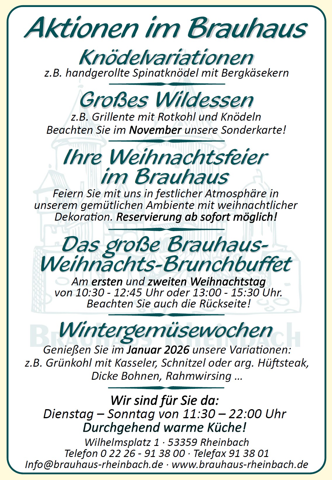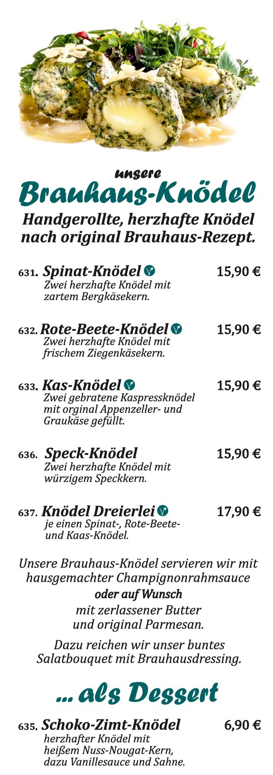 Wir bieten Ihnen neben unserer großen Speisekarte eine täglich wechselnde Tageskarte. Darüber hinaus der Jahreszeit entsprechend Aktionen aus unserer Brauhausküche.